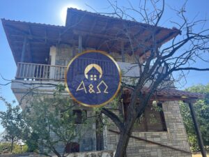 Το ισόγειο είναι 55τ.μ., σαλόνι με τζάκι, κουζίνα και wc, με μεγάλη βεράντα.